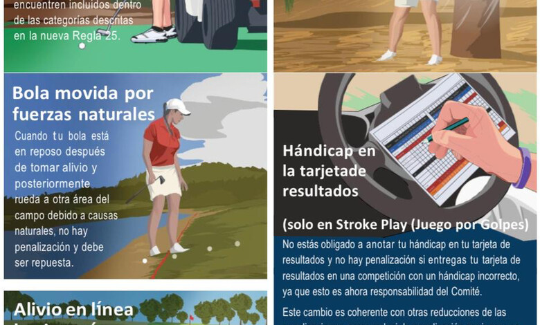 - Bola movida por fuerzas naturales: Una nueva excepción establece que una bola en reposo debe ser repuesta si se mueve a otra área del campo o va a reposar fuera de límites después de ser dropada, colocada o repuesta.