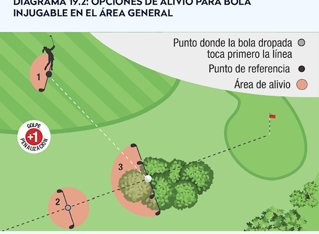 1.- El jugador puede tomar alivio de golpe y distancia jugando la bola original u otra bola desde un área de alivio basada en donde jugó el golpe anterior.