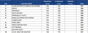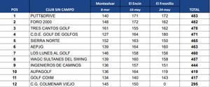 El equipo acreditó un resultado total de 162 puntos con una media de 32.4puntos (5 tarjetas), números que nos han permitido superar la fase de clasificación en una más que meritoria 2ª posición a tan solo 1 punto del equipo 1er clasificado (PUT & DRIVE). Ay, seguro que al leer esta crónica alguno se acuerda de ese putt que no llegó a entrar por falta de concentración o de suerte. Enhorabuena a los participantes. A continuación algunos de los equipos clasificados.