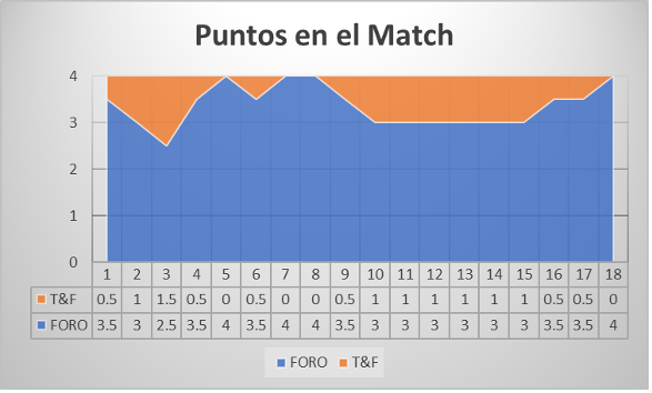 Transcurridos 9 hoyos, teníamos 2 puntos en la mano y los otros dos muy disputados, aunque a nuestro favor. Fue en ese momento cuando la sombra del empate se posó sobre el corazón de algunos de nuestros foreros enganchados a la pantalla del móvil, aunque el buen hacer de los nuestros consiguieron mantener la calma y el resultado estable hasta que a falta de 5 hoyos llegó nuestro primer punto, así como informaciones muy alentadoras de otros 2 partidos que estaban francamente de cara (a falta de 5 hoyos uno iba 4 arriba y otro 3).