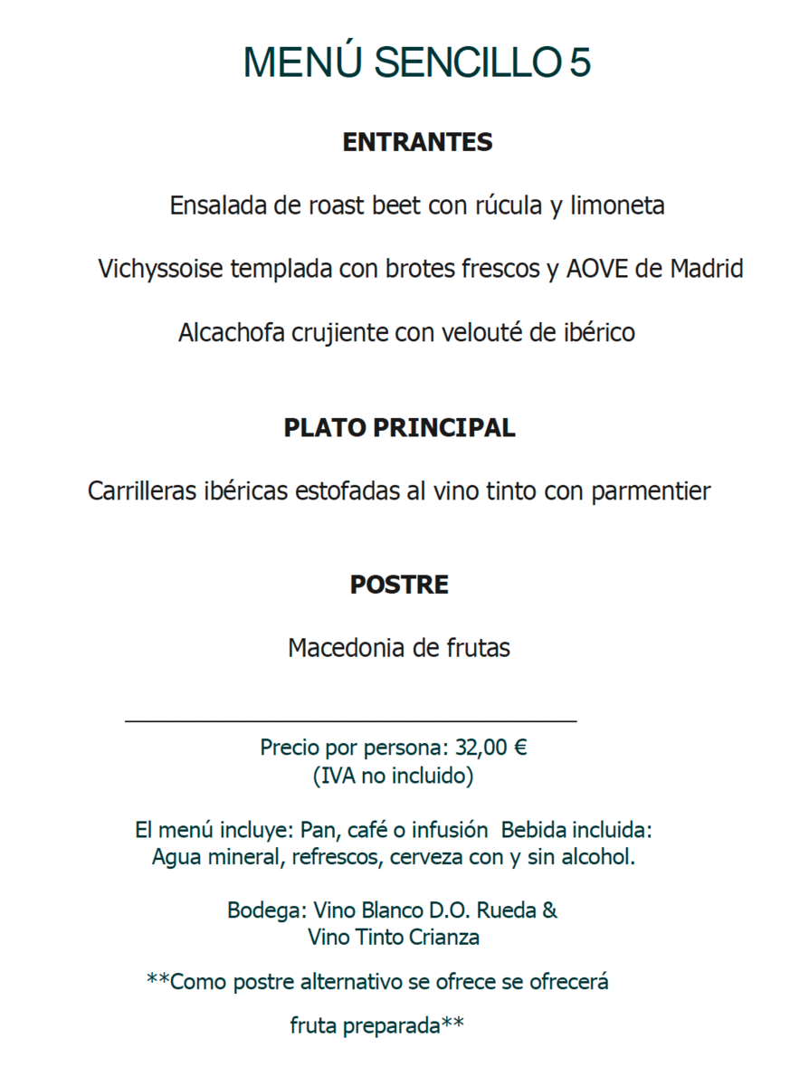 La comida tiene un coste aparte de 32 euros y el menú es el siguiente: